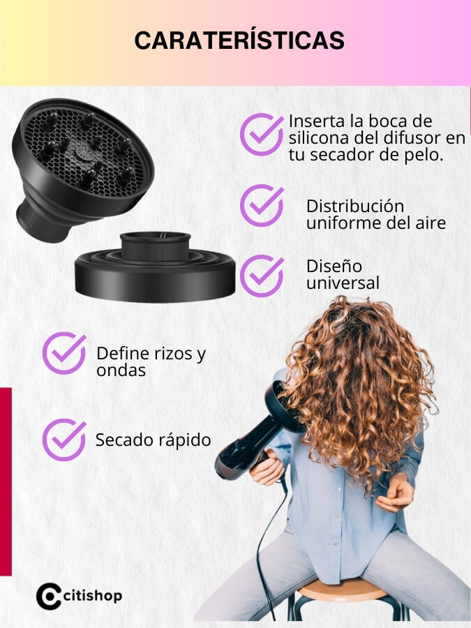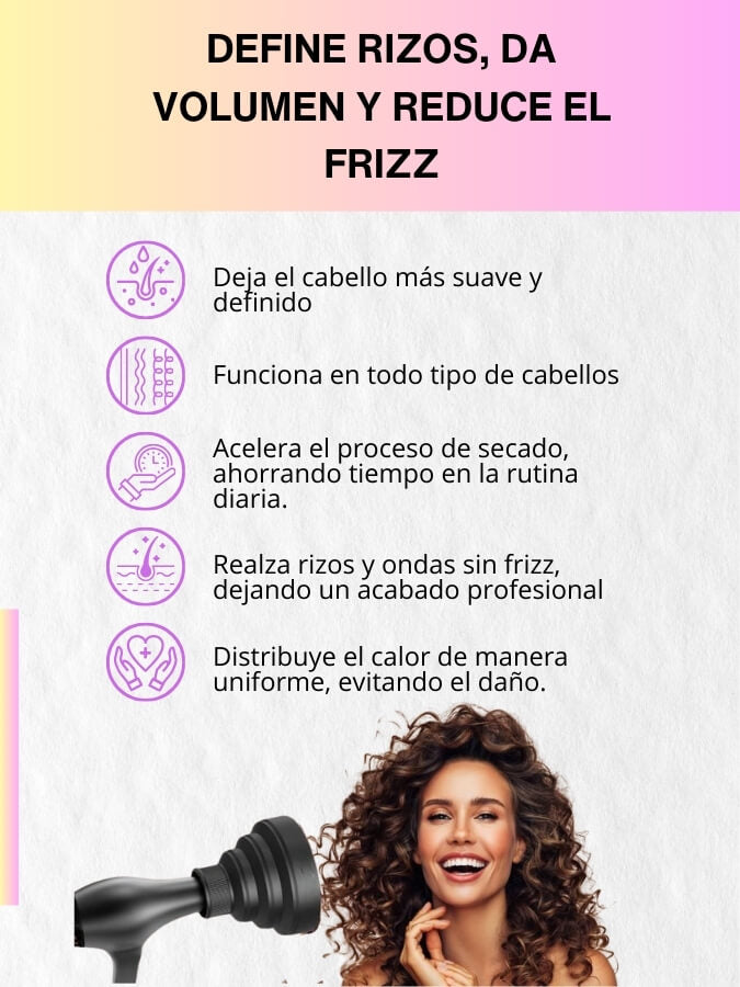 Seca el cabello más rápido que un difusor convencional, ya que distribuye mejor el calor, reduciendo el tiempo de secado sin dañar el cabello.